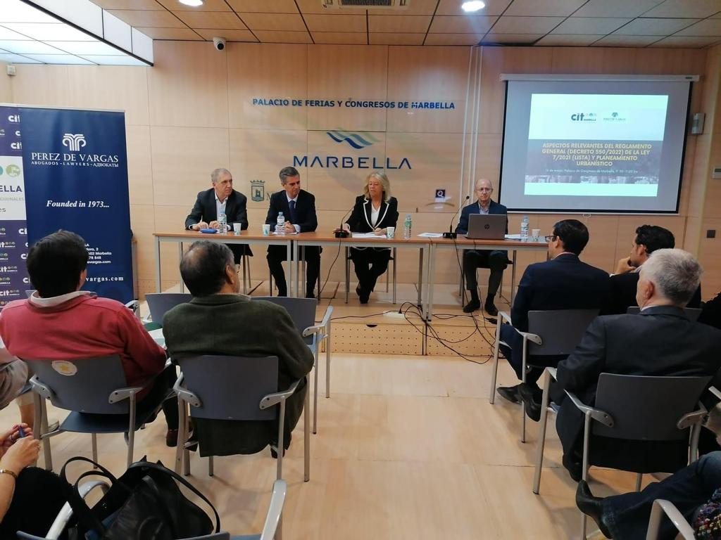 Compartimos algunas fotografías de la jornada «Aspectos relevantes del Reglamento General (Decreto 550/2022) de la Ley 7/2021 (LISTA) y planeamiento urbanístico» celebrada por la Asociación de Empresarios y Profesionales, CIT Marbella y Pérez de Vargas Abogados el día 16 de marzo, en la que fueron ponentes D. José María Morente Monte, Director de Urbanismo y Vivienda en el Ayuntamiento de Marbella, y D. Ignacio Pérez de Vargas López. La jornada fue inaugurada por la Alcaldesa de Marbella, Dª Angeles Muñoz, y por el Presidente de CIT Marbella, D. Juan José González.